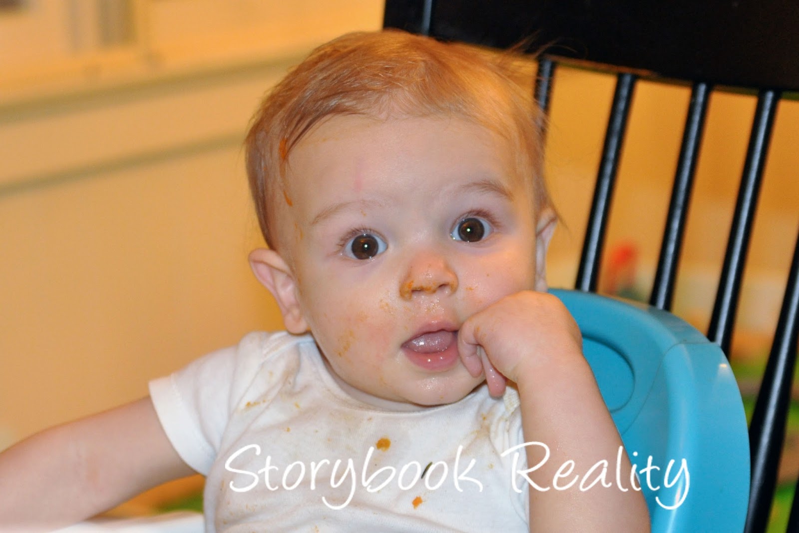 The Littlest Guy is a food lover just like his Mama. He will eat just about anything and he eats it with enthusiasm! So far his favorites include ham, bananas, peas and sweet potatoes. He wants to try anything we are eating and since he has been tiny he has wanted to sit at the table with us while we are eating. When he is sitting in his chair he beats his hand on the tray until you feed him. He is quite insistent! He is nine months old this month and still nurses five times a day and eats solids three times a day as well. I love watching him enjoy food!!