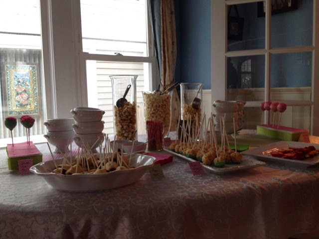 Amd let's talk about this wonderful food!! Their theme was "ready to pop". Everything was pink and green. There was a popcorn bar....cake pops....strawberry/kiwi kabobs....rice krispie treat pops. It was all pink and green and it was all delicious!!